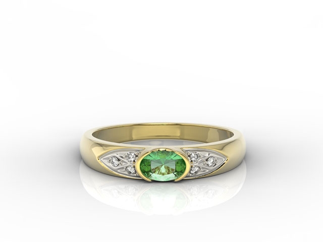 Szmaragdowe serce otoczone żółtą aureolą. Kompozycję dopełniają symetryczne, diamentowe skrzydła. Bardzo klasyczna, iście anielska propozycja opiera się na obrączkowej ramie z żółtego złota.