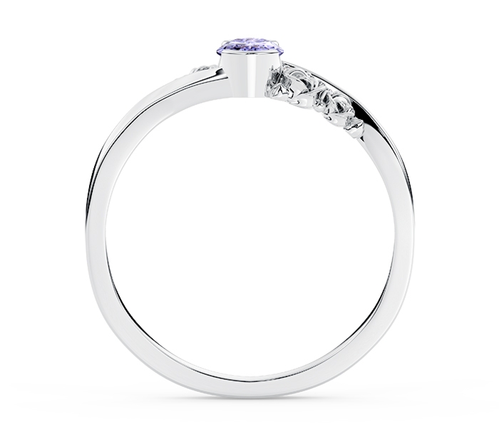 Oryginalny pierścionek z dużym centralnym kamieniem w kształcie owalu i diamentami oprawionymi wśród stylizowanych paków róży.