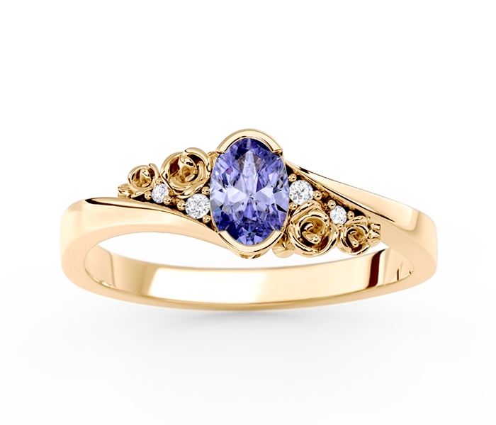 Oryginalny pierścionek z dużym centralnym kamieniem w kształcie owalu i diamentami oprawionymi wśród stylizowanych paków róży.