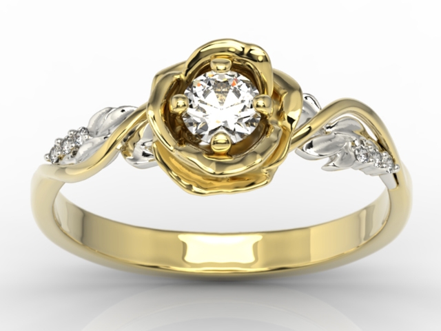 Śliczny pierścionek w kształcie konwalii, z oprawionym centralnie białym brylantem