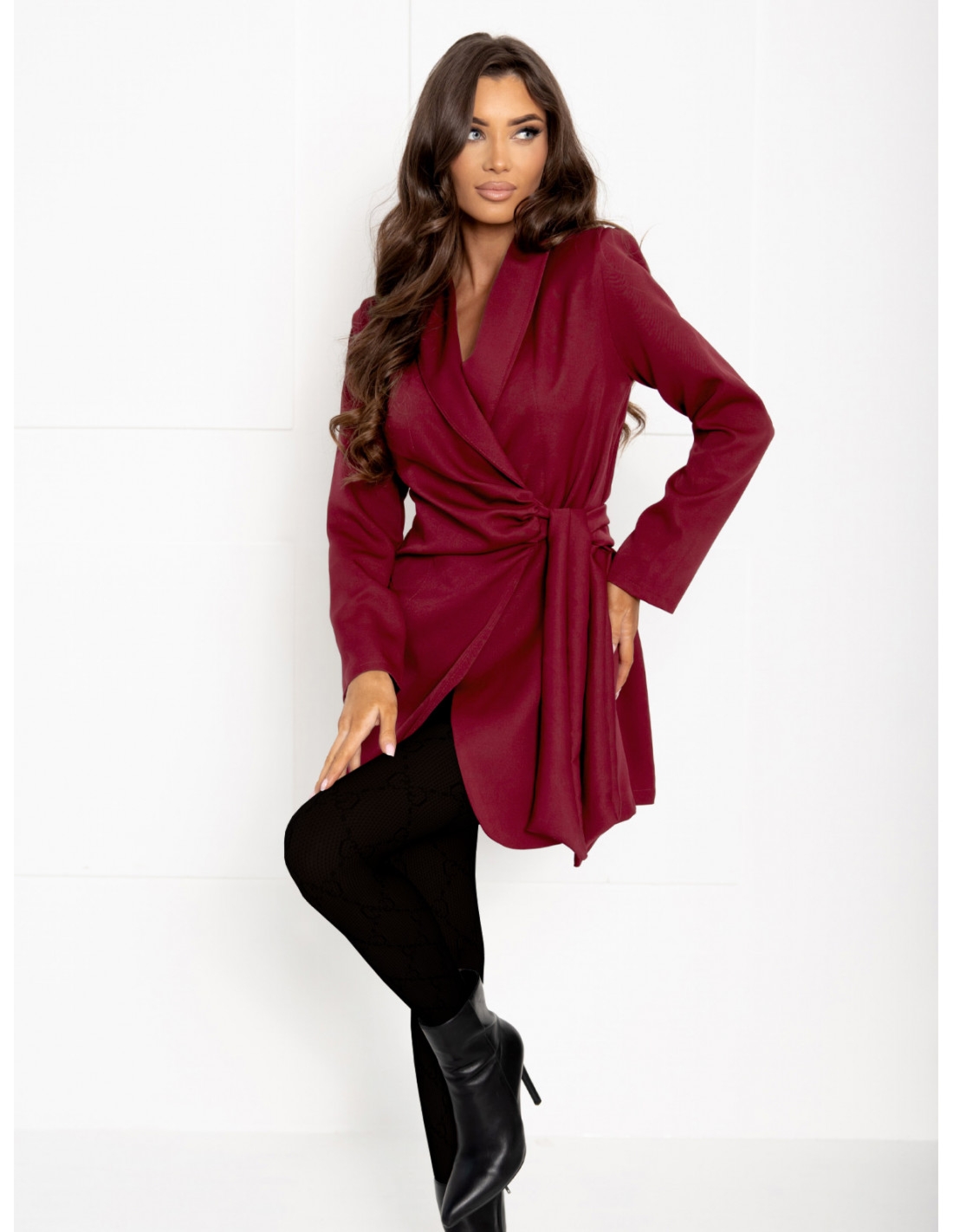 Przekładana marynarka z wiązaniem ETIEN – bordowa Odkryj naszą elegancką, długą marynarkę z przekładanym przodem i delikatnym wiązaniem, która stanie się kluczowym elementem Twojej garderoby! Jej wywijany kołnierz oraz wszyte poduszki w ramionach nadają sylwetce wyjątkowego charakteru, podkreślając Twoją pewność siebie w każdej sytuacji. Idealna do pracy w biurze, świetnie komponuje się z klasycznymi spodniami i białą koszulą, tworząc elegancki, profesjonalny look. Na wieczorne wyjście do klubu wystarczy zestawić ją z dopasowanymi legginsami i efektowną bluzką, aby dodać stylizacji odrobiny pazura. Wybierz marynarkę, która łączy w sobie nowoczesność z ponadczasową elegancją, i poczuj się wyjątkowo w każdej chwili! Jej uniwersalny charakter sprawia, że jest idealnym rozwiązaniem na różne okazje. Nie czekaj, dodaj odrobinę luksusu do swojej garderoby i bądź gotowa na wszelkie wyzwania! Zamów marynarkę w kolorze bordo już dziś i spraw, by każda chwila była wyjątkowa!