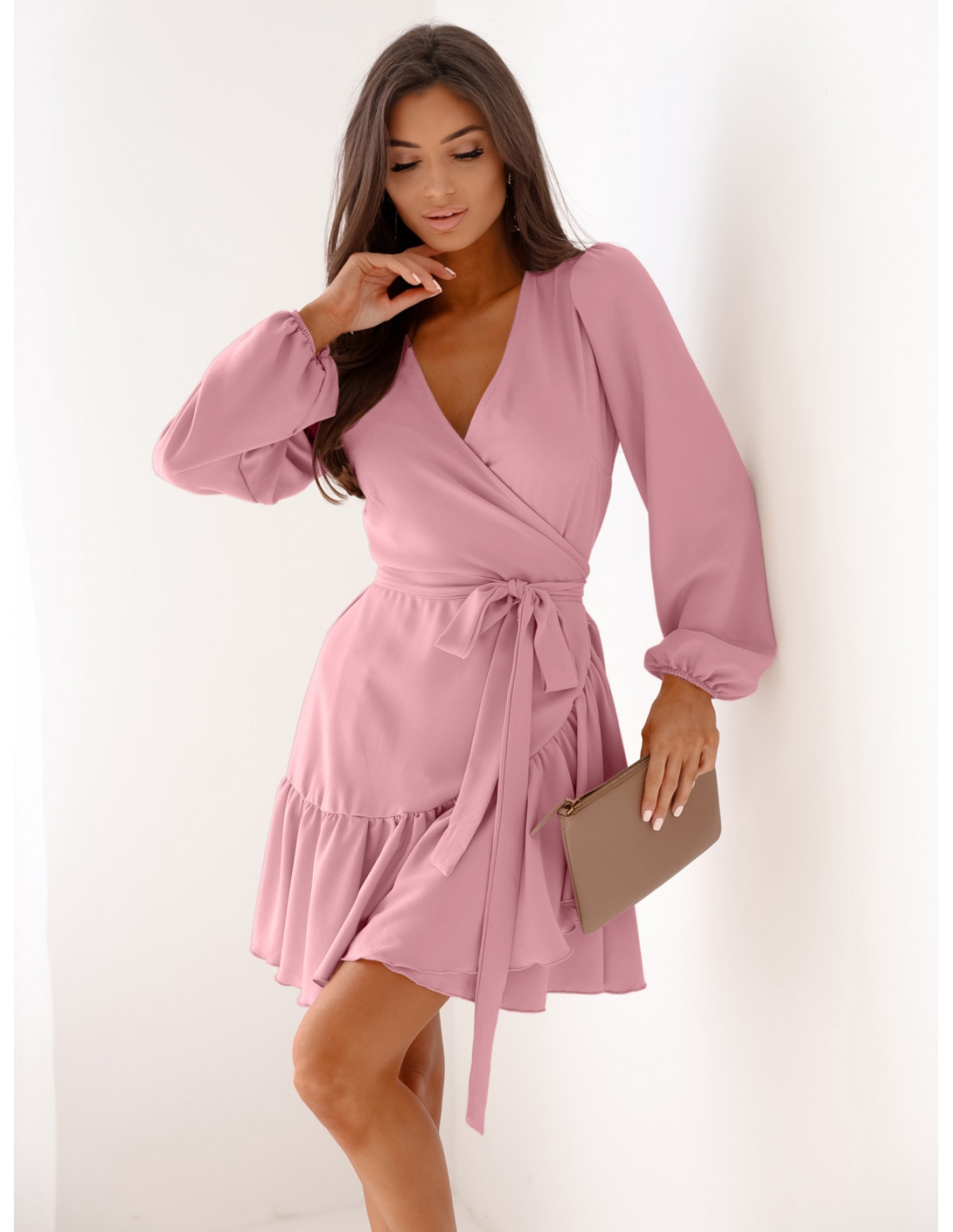 Przekładana sukienka z falbaną LURETTE – brudny róż Odkryj elegancję i kobiecy urok w naszej przekładanej sukience LURETTE z falbaną! Ta wyjątkowa sukienka na długi rękaw, zakończony delikatnymi gumkami, zapewni Ci komfort i swobodę noszenia, jednocześnie podkreślając Twoją sylwetkę dzięki subtelnym marszczeniom na ramionach i zaszewkom na biuście. Przekładany fason z wiązaniem pozwala na idealne dopasowanie do figury, a falbana na dole dodaje lekkości i romantycznego charakteru. To uniwersalna propozycja na wiele okazji – sprawdzi się zarówno na co dzień, jak i podczas wieczornych wyjść czy romantycznych randek. Połącz ją z wysokimi szpilkami i elegancką torebką, by stworzyć klasyczny, kobiecy look, albo zestaw z botkami i casualową kurtką na bardziej codzienne stylizacje. Sukienka LURETTE to idealny wybór dla kobiet ceniących sobie komfort i styl w jednym! Przekładana sukienka w kolorze brudnego różu to uniwersalny wybór.
