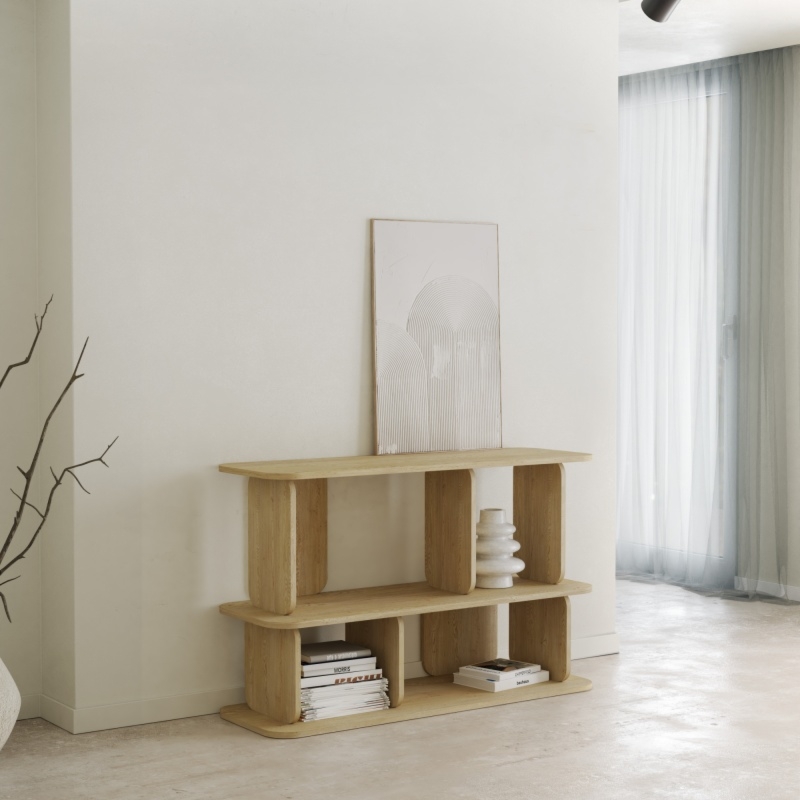 Regał Tulumo zachwyca już od pierwszego spojrzenia. Jego nowoczesna forma bazuje na zaokrąglonych liniach i geometrycznej harmonii, które przyciągają uwagę swoją estetyką i wyważoną kompozycją. Trójpoziomowa konstrukcja z pionowymi, różnorodnie rozmieszczonymi przegródkami nie tylko tworzy intrygujący efekt wizualny, ale też zapewnia stabilność i praktyczność użytkowania.