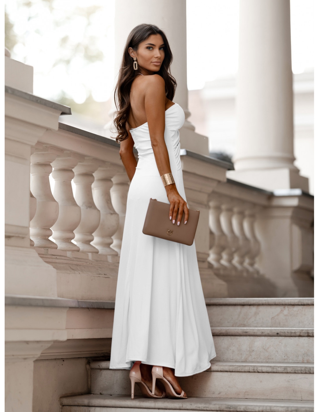 Rozkloszowana sukienka maxi z prążka LARIVIA – biała Ta niezwykle kobieca maxi sukienka stanie się Twoim najlepszym sprzymierzeńcem podczas wyjątkowych okazji! Wykonana z prążkowanego, elastycznego materiału pięknie podkreśla figurę, jednocześnie zapewniając pełen komfort i swobodę ruchów. Usztywniane miseczki gwarantują perfekcyjne podtrzymanie biustu, dzięki czemu poczujesz się pewnie i komfortowo przez cały dzień lub wieczór. Efektowne wycięcia na przodzie sukienki dodają stylizacji zmysłowego charakteru, idealnie komponując się ze sznurkiem wiązanym na karku. Rozkloszowany dół delikatnie faluje przy każdym kroku, nadając całości lekkości i elegancji. Idealnie sprawdzi się w zestawie z wysokimi sandałkami na obcasie oraz złotą biżuterią – efektownymi kolczykami oraz bransoletką. W chłodniejsze dni warto dodać elegancką marynarkę lub lekkie bolerko, które podkreślą elegancję całej stylizacji. Postaw na tę białą sukienkę i przyciągaj spojrzenia wszędzie, gdzie się pojawisz!