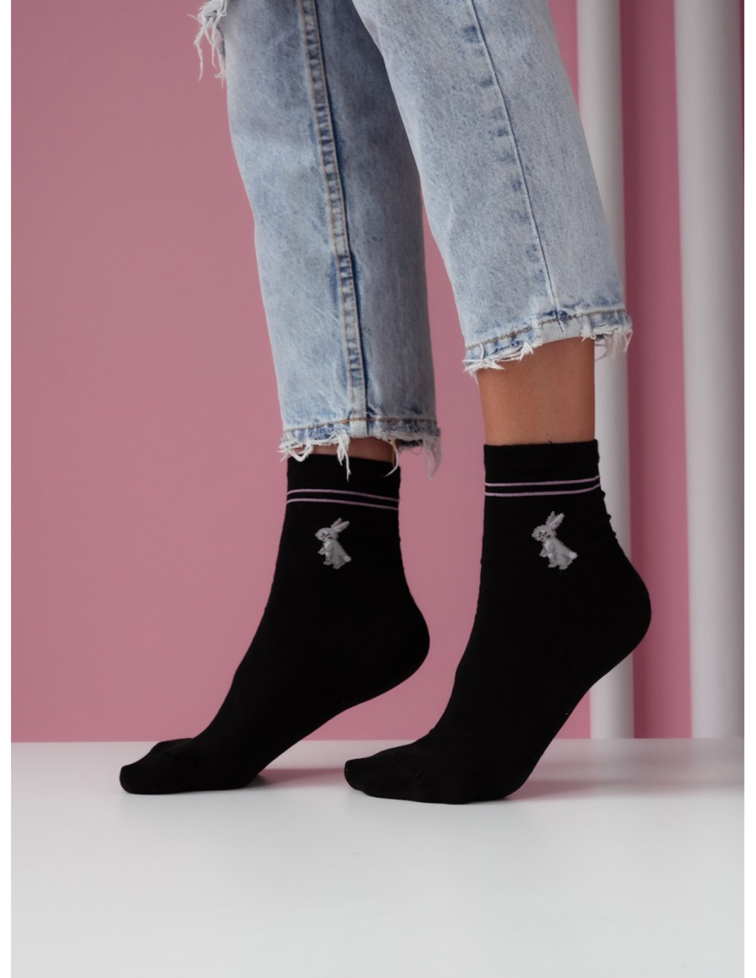 Skarpetki damskie KRóLICZKI Z PASKAMI – czarne Te bawełniane skarpetki z uroczą aplikacją króliczka to doskonały wybór dla osób ceniących subtelne, ale efektowne detale