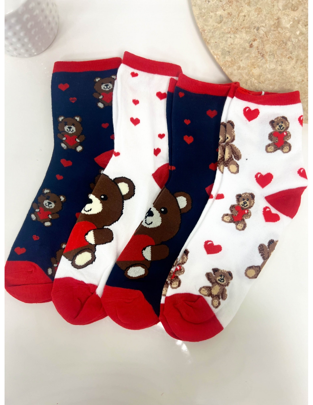Skarpetki KORO- wzór 2 Skarpetki damskie, które łączą w sobie elegancję z nutą słodkiego uroku, idealnych na prezent walentynkowy. W kolekcji znajdują się cztery wzory, każda z nich oferuje odmienny projekt z sercem i tematycznym motywem misia, symbolizując ciepło i miłość. Głębokie granaty, klasyczna biel i radosne czerwienie tworzą tło dla zabawnych grafik, dodając odrobinę koloru do każdego stroju. Skarpetki te, wykonane z miękkiego, elastycznego materiału, zapewniają wygodę i dopasowanie do każdej sylwetki. Motyw misiów dodaje każdej parze indywidualnego charakteru, idealnego dla kobiet ceniących sobie oryginalność i urocze detale. Te walentynkowe skarpetki to nie tylko komfortowe akcesorium, ale również wyrazisty dodatek, który może być miłym upominkiem dla ukochanej osoby. Dostępne w wielu rozmiarach, stanowią słodki i funkcjonalny element garderoby każdej pani. Wzór 2 to białe skarpetki z dużym misiem trzymający serduszko.