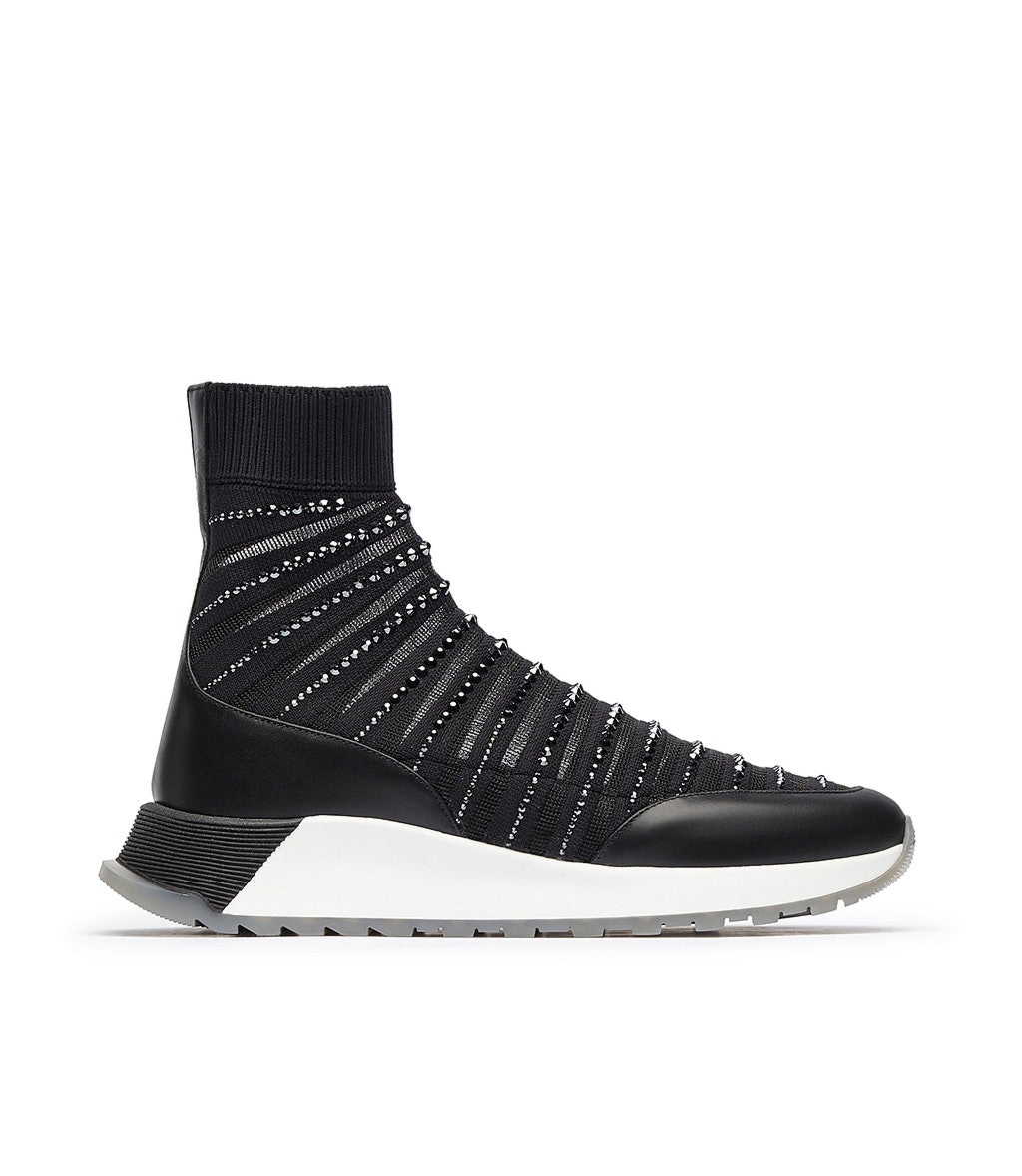 Zdobione kryształami skarpetkowe sneakersy Loriblu. To świetne połączenie stylu sportowego i glamour, który doda charakteru każdej Twoje stylizacji. Skarpetkowa cholewka sięga za kostkę. Materiał świetnie dopasowuje się do stopy. Jest wysadzany drobnymi kryształkami, które nadają biżuteryjnego charakteru i pięknie odbijają światło. Z czarną cholewką kontrastuje biała podeszwa. Loriblu to włoska marka rodzinna, która specjalizuje się w luksusowym obuwiu. Każdy model wykonany jest ze szczególną dbałością o szczegóły.