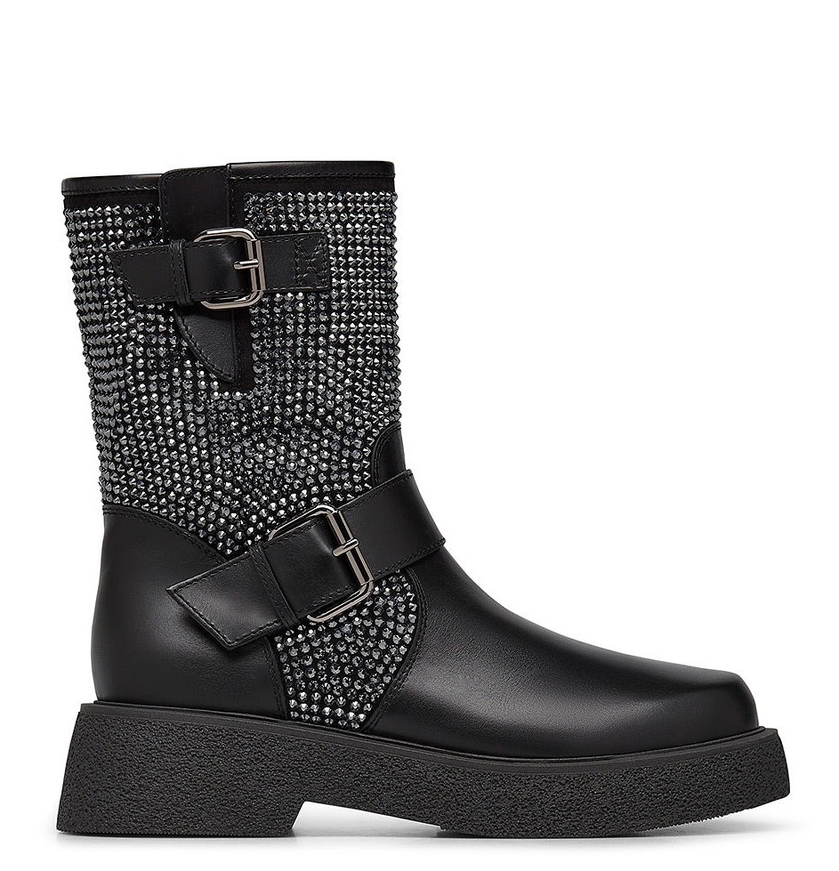 Bikery Loriblu skórzane z kryształami. Mają wysokość za kostkę i okrągły nosek. Cholewka zdobiona jest małymi kryształkami, które nadają biżuteryjnego efektu i pięknie odbijają światło. Bikery Loriblu mają dwa paski i są zapinane na zamek błyskawiczny po wewnętrznej części. Świetnie sprawdzą się w rockowych stylizacjach, na przykład w połączeniu z jeansowymi szortami, topem i kurtką skórzaną. Loriblu to włoska marka rodzinna, która specjalizuje się w luksusowym obuwiu. Każdy model wykonany jest ze szczególną dbałością o każdy szczegół.