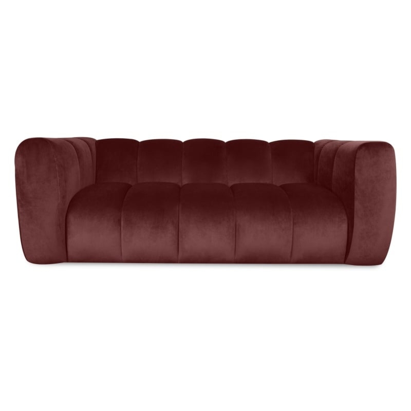 Sofa została obita miękką, welurową tkaniną w burgundowym odcieniu, co podkreśla jej stylowy wygląd i zapewnia przyjemny dotyk. Siedzisko, wypełnione wysokiej jakości pianką oraz sprężyną falistą, gwarantuje wyjątkowy komfort i doskonałe podparcie, idealne do codziennego użytkowania. Szerokie podłokietniki nie tylko podkreślają elegancki wygląd sofy, ale także zwiększają jej funkcjonalność, oferując wygodne miejsce do oparcia rąk.