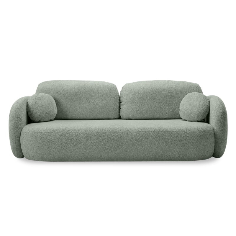 Sofa rozkładana Olio z pojemnikiem, szałwiowa, boucle, obłe kształty