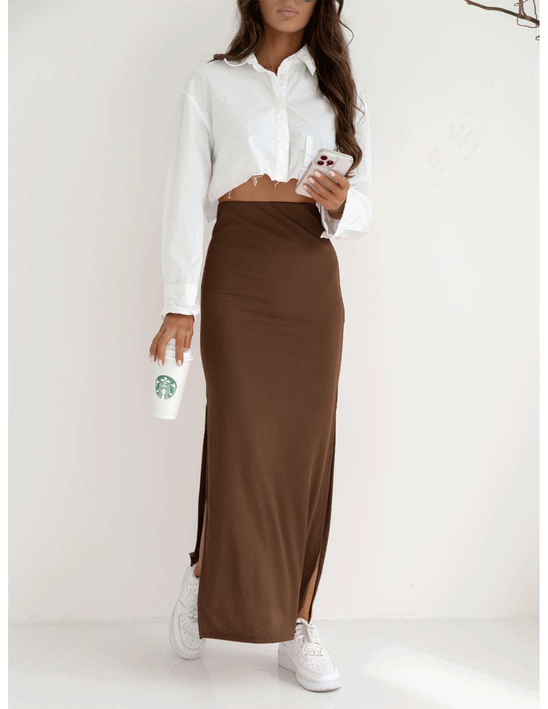 Spódnica maxi prążkowana MALWA – cappuccino Stylowa spódnica maxi to idealny wybór dla kobiet, które lubią wyróżniać się w tłumie. Wysoki stan i dopasowany fason pięknie podkreślają sylwetkę, a rozporki po bokach dodają odważnego charakteru i zapewniają swobodę ruchów. Wykonana z elastycznego, prążkowanego materiału, idealnie przylega do ciała, gwarantując jednocześnie komfort noszenia przez cały dzień. To uniwersalny model, który świetnie komponuje się zarówno z eleganckimi, jak i casualowymi dodatkami. Zestaw ją z ulubionymi sneakersami na co dzień lub szpilkami na wieczorne wyjście. Cappuccino to idealny kolor na jesień!
