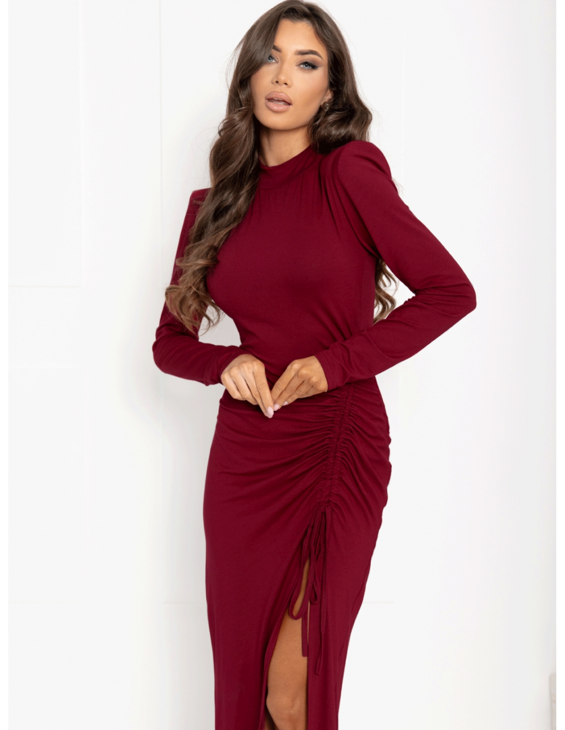 Sukienka maxi z marszczeniem z wiskozy IDRIL – bordowa Sukienka maxi IDRIL to propozycja, która łączy klasykę z nowoczesnym akcentem. Uszyta z wysokogatunkowej wiskozy, gwarantuje nie tylko komfort noszenia, ale także piękne dopasowanie do sylwetki. Marszczenie z boku z możliwością regulacji pozwala dostosować długość rozporka do okazji i stylizacji. Poduszki na ramionach dodają struktury i szyku, a długie rękawy wprowadzają elegancję. To model, który sprawdzi się na każdą wyjątkową okazję. Marszczenie z boku – nie tylko podkreśla talię, ale także daje możliwość regulacji długości rozporka. Poduszki na ramionach – dodają charakteru i idealnie równoważą sylwetkę. Wysokogatunkowa wiskoza – zapewnia wygodę i doskonałe dopasowanie. Długi rękaw i długość maxi – doskonałe na eleganckie, wieczorowe okazje. Połącz sukienkę IDRIL z sandałkami na szpilce w czarnym kolorze, srebrnymi kolczykami i kopertówką. Idealny zestaw na elegancki bankiet. Dodaj cieliste szpilki, złotą biżuterię i subtelny makijaż. Stylizacja, która zachwyci każdą osobę! Zestaw ją z botkami na obcasie, rajstopami w odcieniu nude i torebką w kolorze złotym. Sukienka maxi IDRIL to propozycja dla kobiet, które uwielbiają modę z klasą i odrobiną zmysłowości. Dodaj ją do swojej garderoby i ciesz się stylizacjami, które zawsze robią wrażenie!