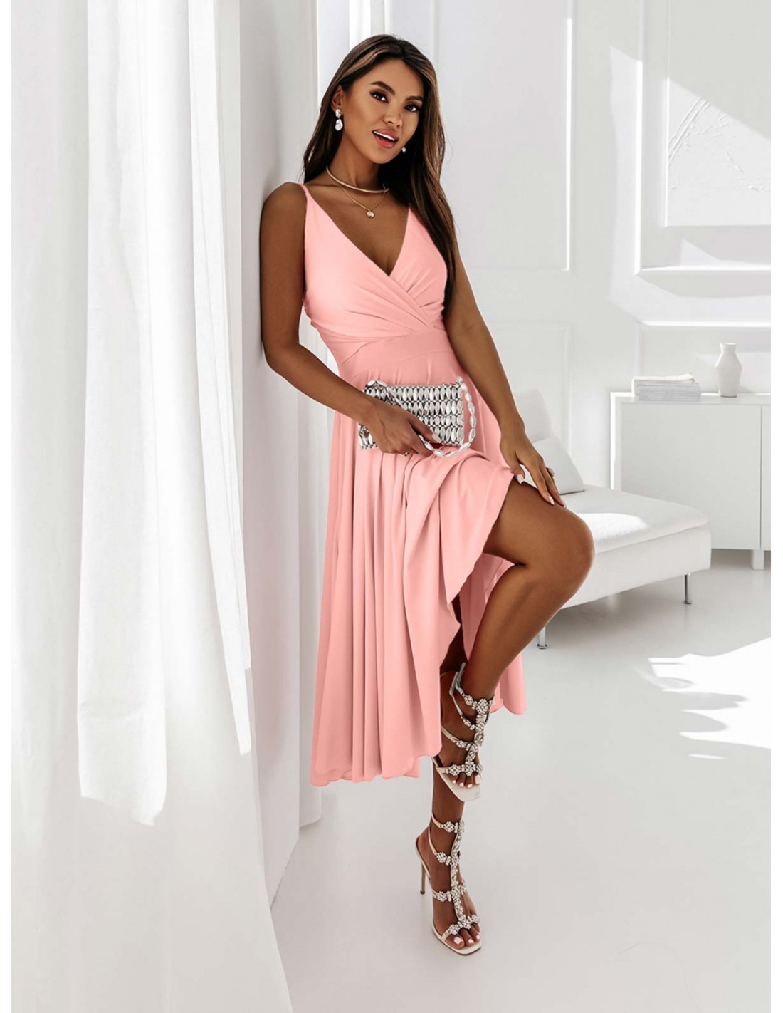Sukienka midi na ramiączkach AGNES – pudrowy róż Spektakularna rozkloszowana, midi sukienka. Robi niesamowite wrażenie na każdej kobiecie. Spódnica została wykonana z pełnego koła, dzięki czemu nieziemsko faluje podczas każdego ruchu. Odcięcie w talii podkreśla kobiecą sylwetkę, a przekładany delikatnie dekolt na cienkich ramiączkach podkreśla ramiona. To model bardzo uniwersalny, dopasowujący się do każdego rodzaju figury. To nasza propozycja numer 1 na wszelkiego rodzaju imprezy okolicznościowe. Idealna na wesele, na przyjęcie rodzinne, a także na wiosnę i lato do bardziej oficjalnych spotkań. Pudrowy róż wygląda niezwykle dziewczęco.