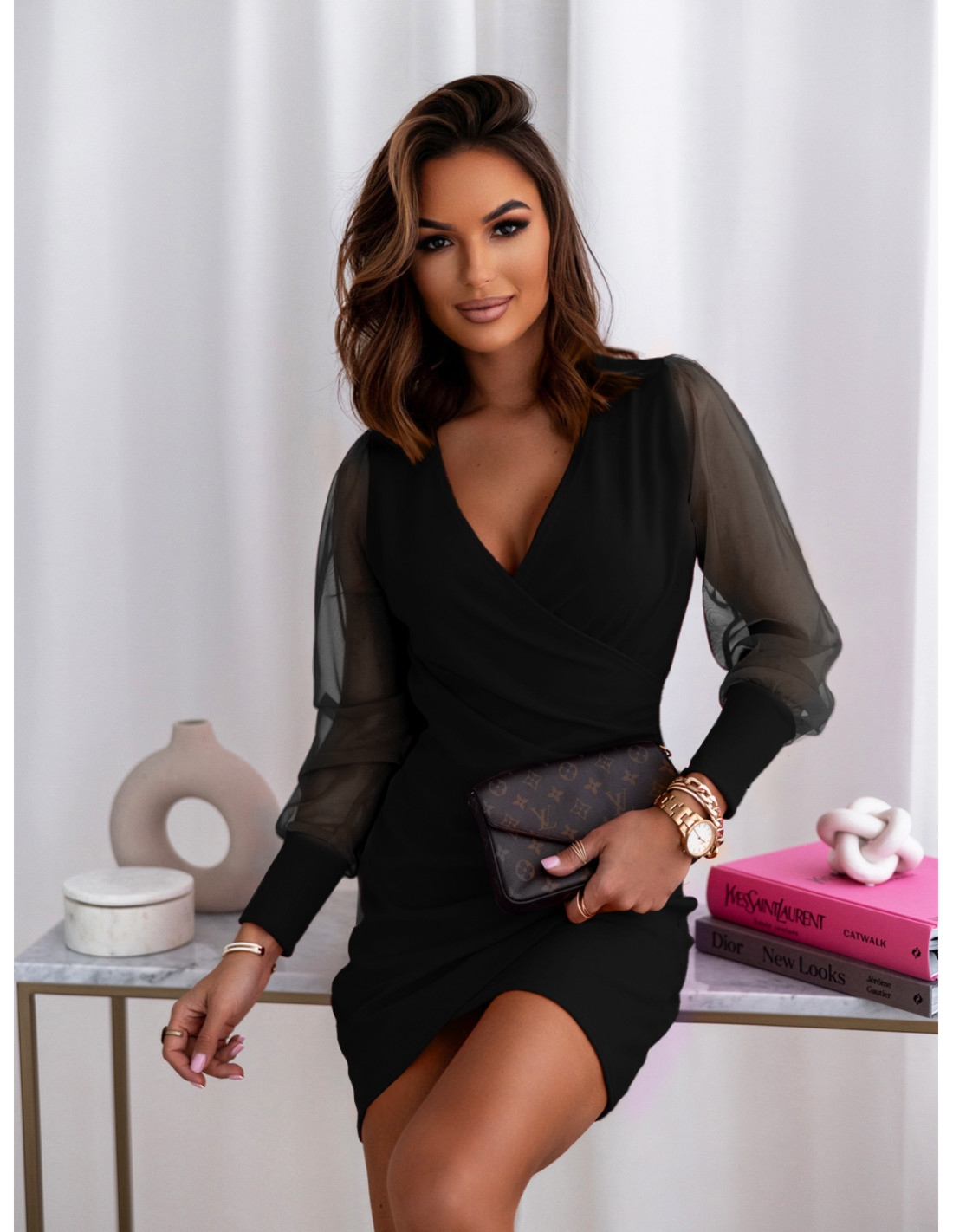 Sukienka mini z tiulowymi rękawami – SAYNA – czarna Stylowa i bardzo elegancka sukienka SAYNA to rewelacyjny wybór na imprezy okolicznościowe. Wykonana z gładkiego elastycznego materiału w połączeniu z tiulem, co wygląda bardzo elegancko. Tiulowe, lekko bufiaste rękawki odkryją ramiona, a przekładany dekolt subtelnie wyeksponuje Twój biust. Długość mini pozwoli Ci pokazać Twoje zgrabne nogi. Model Sanya to również doskonały pomysł na gwiazdkowy prezent dla siostry czy przyjaciółki. Czarna sukienka to zawsze dobry pomysł na modny i elegancki look.
