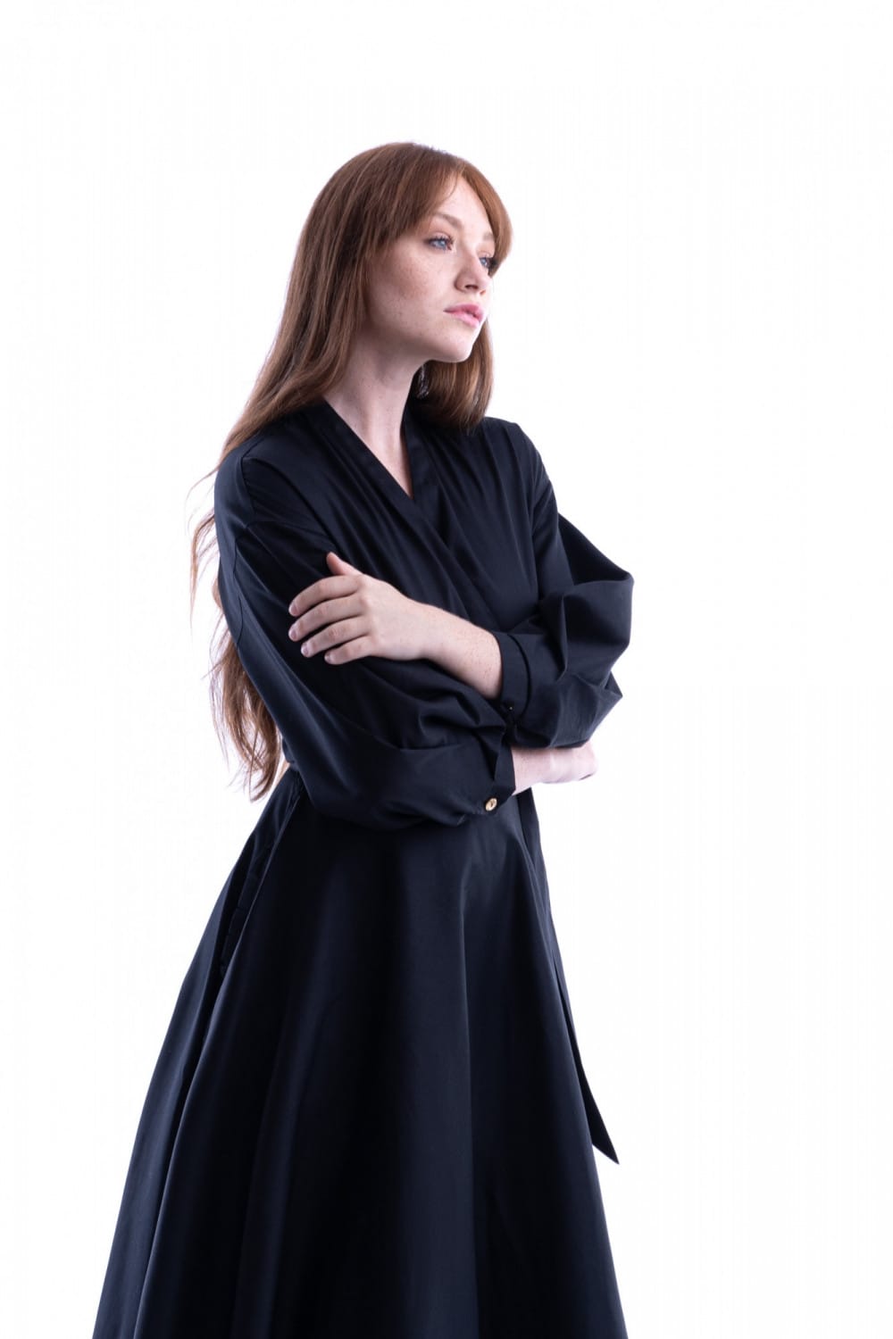 Czarna, szlafrokowa sukienka midi z dekoltem V-neck. Sukienka z długim rękawem jest wiązana w pasie i sama możesz regulować jej fason tak, by jak najlepiej pasował do Twojej figury. Dodatkową zaletą tego modelu jest spódnica z głębokim wycięciem, która daje pełną swobodę ruchów i pozwala wyeksponować nogi. Czarną sukienkę kopertową noś do czarnych butów na wysokim obcasie. skład: 100% bawełna XS S M L 1/2 BIUST 53 55 57 59 1/2 TALIA 40 42 44 46 RĘKAW 49,5 50 50,5 51 DŁUGOŚĆ 116,5 117 117,5 118