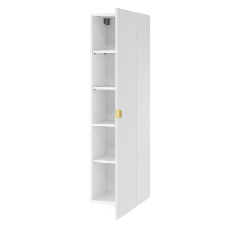 Szafka łazienkowa słupek Arcos to harmonijne połączenie stylu i funkcjonalności, które odmieni każdą łazienkę. Subtelny ryflowany front przyciąga wzrok, nadając wnętrzu nowoczesny charakter, a złoty uchwyt dodaje elegancji.