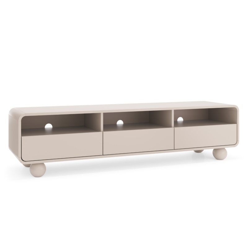 Albion to szafka RTV, która zachwyca dopracowanymi detalami. Wybarwienie w odcieniu kaszmiru nadaje jej subtelności, a obłe linie i zaokrąglone krawędzie dodają przytulnego, a zarazem nowoczesnego charakteru. Nietuzinkowe kuliste nóżki przyciągają wzrok i stają się dekoracyjnym akcentem, który wyróżnia mebel na tle standardowych modeli.