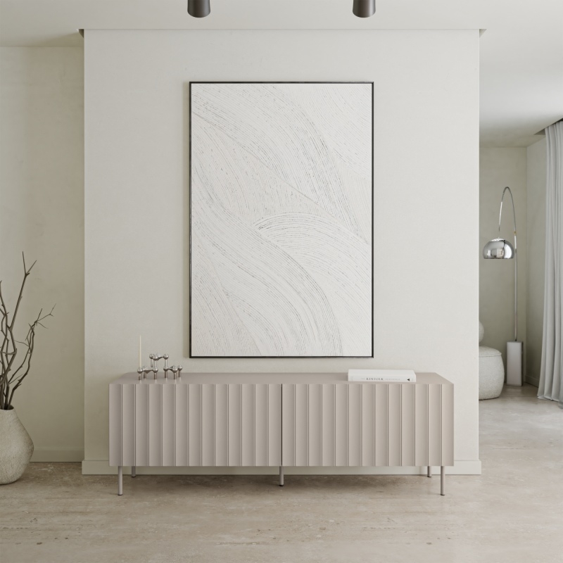 Odkryj szafkę RTV Averla – mebel, który łączy w sobie nowoczesny design i praktyczne rozwiązania, stając się centralnym punktem Twojej strefy rozrywki. Jej subtelny, szarobeżowy odcień wprowadzi do Twojego wnętrza harmonię i spokój, a ryflowane fronty dodadzą mu unikalnego charakteru i wizualnej głębi.