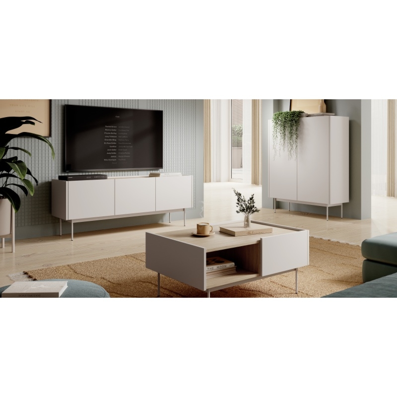 Rozświetl swoje wnętrze nowoczesnym stylem dzięki szafce RTV Color. To niezwykłe połączenie funkcjonalności i estetyki, które sprawi, że Twój salon nabierze wyjątkowego charakteru.Beżowa konstrukcja nadaje szafce unikalny charakter, tworząc efektowne połączenie kolorów, które z pewnością przyciągnie uwagę każdego miłośnika stylowych wnętrz. Metalowe nóżki, utrzymane w tym samym odcieniu, nie tylko dodają meblowi lekkości, ale także podkreślają jego nowoczesny wygląd, sprawiając, że staje się ona centralnym punktem Twojego salonu. Blat oraz wnętrze szafki zostało starannie wykończone w naturalnym kolorze dębu, nadając meblowi przytulny i ciepły charakter. Dodatkowo, obrzeża ABS zapewniają trwałość i odporność na uszkodzenia, co sprawia, że szafka Color zachowa swoje piękno przez długie lata.
