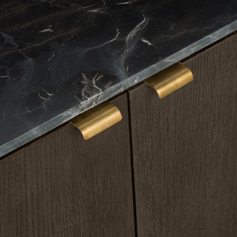 Wyobraź sobie wnętrze, które otula Cię pięknem i harmonią każdego dnia. Szafka RTV Furlo to więcej niż mebel — to element, który nadaje przestrzeni wyjątkowy charakter. Jej miękko zaokrąglone kształty wprowadzają do pomieszczenia spokój, a blat z brązowego marmuru dodaje unikalnej elegancji. Trzy pojemne szafki umożliwiają estetyczne uporządkowanie sprzętu multimedialnego i niezbędnych akcesoriów, dzięki czemu w Twoim salonie zagości ład i porządek. Złote, szczotkowane uchwyty stanowią subtelny akcent, który dopełnia całość, tworząc mebel nie tylko piękny, ale i funkcjonalny. Wybierz Furlo, by codzienność stała się piękniejsza i bardziej uporządkowana.