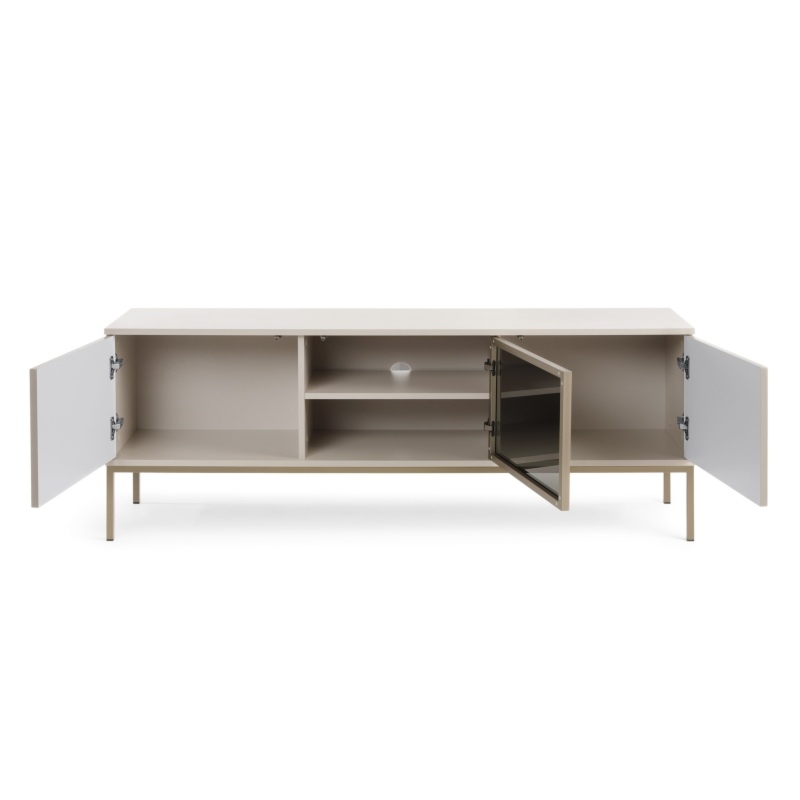 Sento to szafka RTV, która zachwyca swoimi frezowanymi frontami wykonanymi w kolorze kaszmirowym, który nadaje meblowi niepowtarzalnego uroku, wprowadzając do Twojego wnętrza nutę elegancji i przytulności. Korpus utrzymany w kolorze szampańskim, idealnie komponuje się z całością, dodając jej wyjątkowego charakteru.Jedne drzwi z hartowanego szkła to nie tylko element designerski, ale również praktyczne rozwiązanie. Dodatkowo, dzięki zastosowaniu oświetlenia LED, każda prezentowana na półkach rzecz staje się jeszcze bardziej widoczna i efektowna, tworząc niesamowitą atmosferę w Twoim wnętrzu. Szafka RTV Sento została wyposażona w zamykane półki. Dzięki nim możesz bezpiecznie przechowywać różnego rodzaju akcesoria czy kable, utrzymując porządek w swoim salonie.