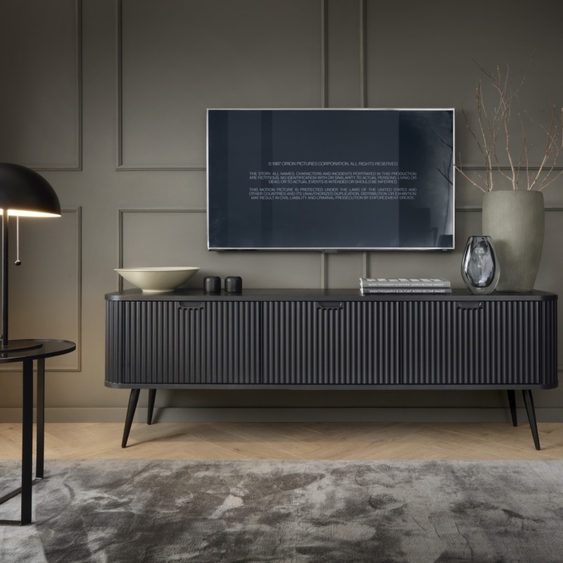 Zaokrąglone krawędzie nadają subtelności, podczas gdy ryflowany korpus dodaje tekstury, tworząc efektowne wrażenie już na pierwszy rzut oka. Czarne, wysokie nóżki dodają lekkości, podkreślając zarazem nowoczesny charakter mebla. Trzy pojemne zamykane szafki to doskonałe miejsce na przechowywanie różnorodnych urządzeń oraz akcesoriów, zapewniając jednocześnie porządek i elegancję w Twoim salonie. Niech Zova Black stanie się nieodłącznym elementem Twojej przestrzeni, zapewniając nie tylko praktyczne rozwiązania do przechowywania, ale również dodając niepowtarzalny urok każdej aranżacji.