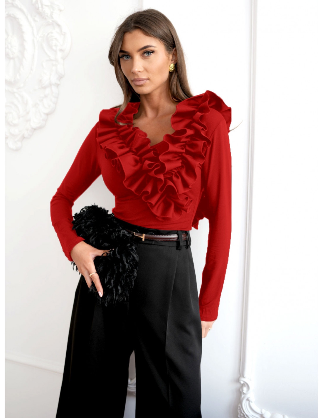 Wiskozowa bluzka z falbanami ORNELLA – czerwona Ta stylowa i oryginalna bluzka to propozycja dla kobiet, które kochają efekt “wow” w eleganickim wydaniu. Wykonana z przyjemnej, atestowanej wiskozy, gwarantuje komfort noszenia przez cały dzień. Jej najbardziej charakterystycznym elementem są wyraziste falbany, które pięknie układają się przy dekolcie i ramionach, tworząc luksusowy, modowy akcent. Długie rękawy nadają całości szyku i sprawiają, że bluzka świetnie sprawdzi się zarówno na co dzień, jak i na wyjątkowe okazje. Fason subtelnie podkreśla sylwetkę, a jednocześnie nie krępuje ruchów, dzięki czemu czujesz się w niej kobieco i swobodnie. To idealny wybór do pracy, na kolację, a nawet na świąteczne spotkania — wszędzie tam, gdzie chcesz wyglądać klasycznie, ale z charakterem. W połączeniu z eleganckimi spodniami wide leg, szpilkami i torebką stworzysz stylizację, która przyciąga uwagę od pierwszego spojrzenia. Jedna bluzka, a tak wiele możliwości — czerwona bluzka to obowiązkowy element w szafie każdej nowoczesnej kobiety.