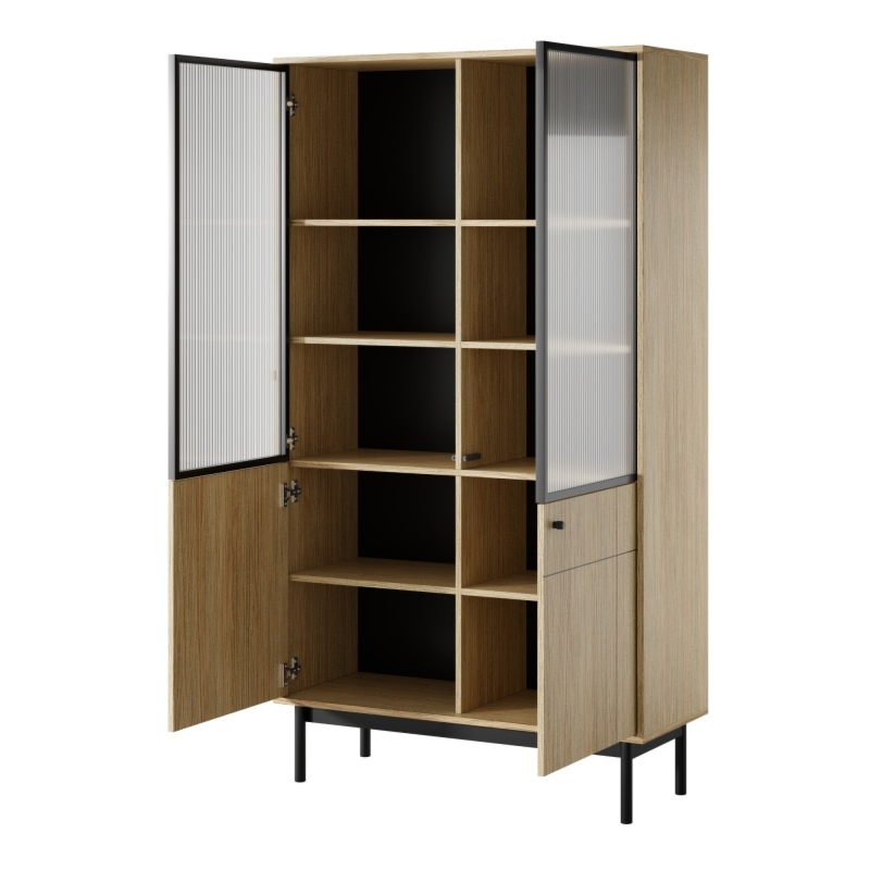 Czarne, drewniane nóżki nie tylko zapewniają stabilność, ale także wprowadzają lekkość do konstrukcji, tworząc interesujący kontrast z jasnym wykończeniem mebla. Front z subtelnym frezem i ryflowaną szybą przyciąga uwagę, podkreślając nowoczesną estetykę i wysoką jakość wykonania. Regał oferuje szerokie półki, idealne do wyeksponowania książek, dekoracji oraz innych przedmiotów, pomagając w utrzymaniu porządku w salonie. W dolnej części znajdują się dwie zamykane szafki, świetnie sprawdzające się do przechowywania dokumentów, odzieży i innych niezbędnych rzeczy. Zawiasy z cichym domykiem gwarantują płynne i bezszelestne otwieranie oraz zamykanie drzwiczek, podnosząc komfort codziennego użytkowania.