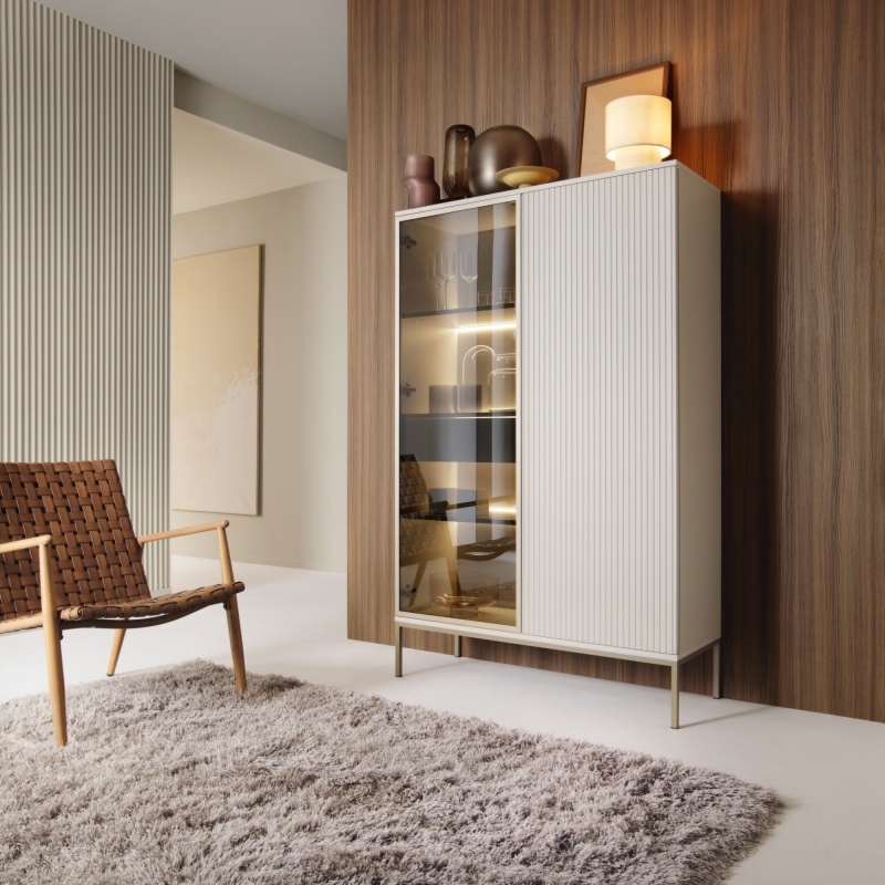 Sento to witryna, która zachwyca swoim frezowanym frontem wykonanym w kolorze kaszmirowym, który nadaje meblowi niepowtarzalnego uroku, wprowadzając do Twojego wnętrza nutę elegancji i przytulności. Korpus utrzymany w kolorze szampańskim, idealnie komponuje się z całością, dodając jej wyjątkowego charakteru.Jedne drzwi wyposażone w hartowane szkło to nie tylko estetyczny akcent, ale także praktyczne rozwiązanie. Pozwala ono na subtelne eksponowanie wybranych przedmiotów wewnątrz witryny, dodając elegancji Twoim ulubionym dekoracjom czy kolekcjom. Wnętrze zostało zaprojektowane z myślą o maksymalnej funkcjonalności. Półki i praktyczna szuflada pozwalają na łatwą organizację i przechowywanie Twoich cennych przedmiotów czy drobiazgów. Dodatkowo, oświetlenie LED nadaje meblowi niezwykłego blasku, eksponując zawartość witryny i dodając jej wyjątkowego charakteru.
