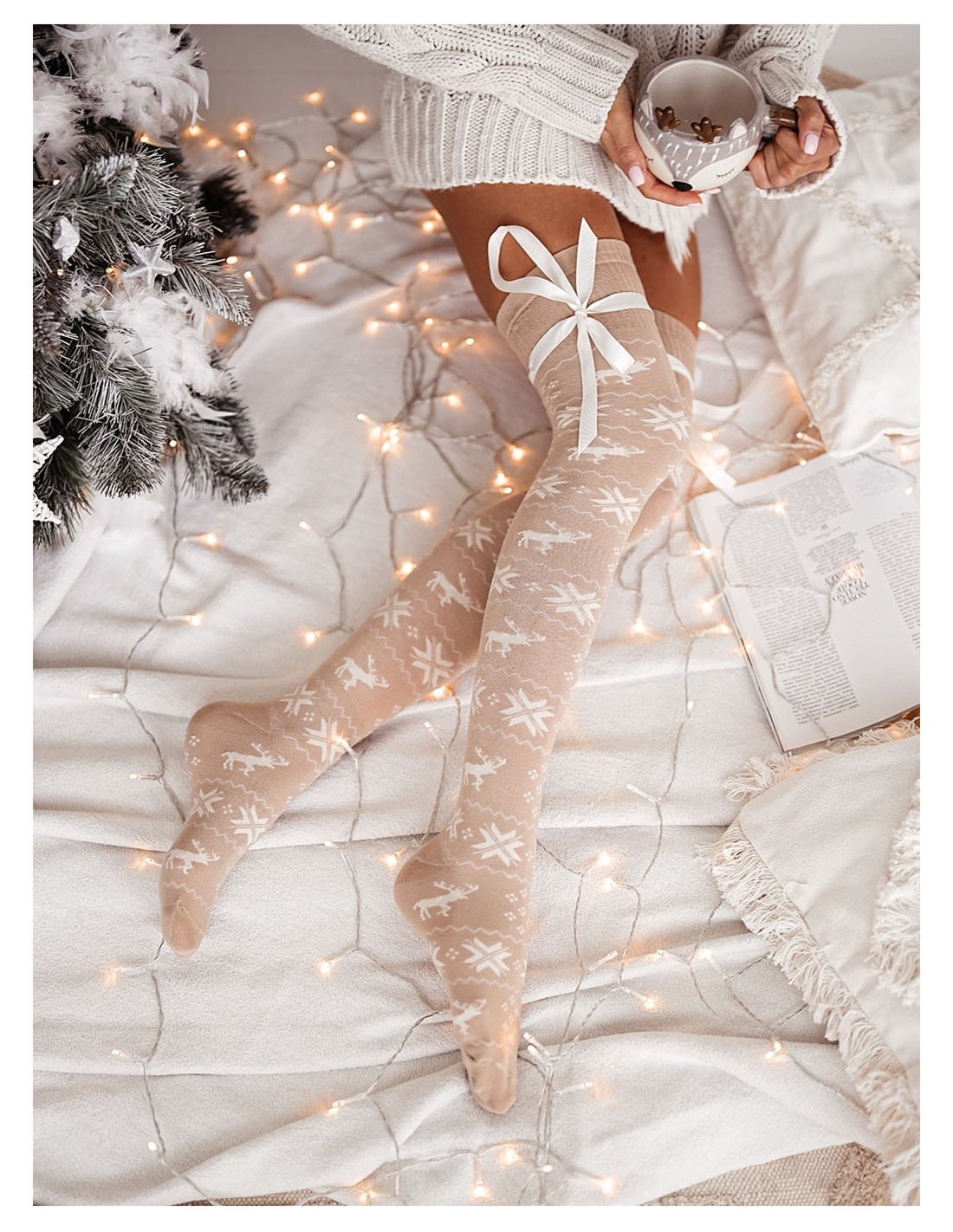 Zakolanówki świąteczne ze wstążką – wzór 6 Wprowadź świąteczną magię do swojej stylizacji dzięki tym urokliwym zakolanówkom z ozdobną wstążką! Wykonane z miękkiego, przyjemnego w dotyku materiału, gwarantują wygodę noszenia nawet podczas długich zimowych wieczorów. Świąteczne wzory z reniferami i śnieżynkami wprowadzą Cię w magiczną atmosferę świąt. Zakolanówki są ozdobione uroczą wstążką, która dodaje im dziewczęcego i stylowego charakteru. Idealne do noszenia zarówno w domu, jak i na świąteczne spotkania, doskonale komponują się z przytulnym swetrem czy sukienką. Beżowy odcień idealnie wkomponuje się w delikatne, codzienne stylizacje, dodając im subtelnej elegancji.