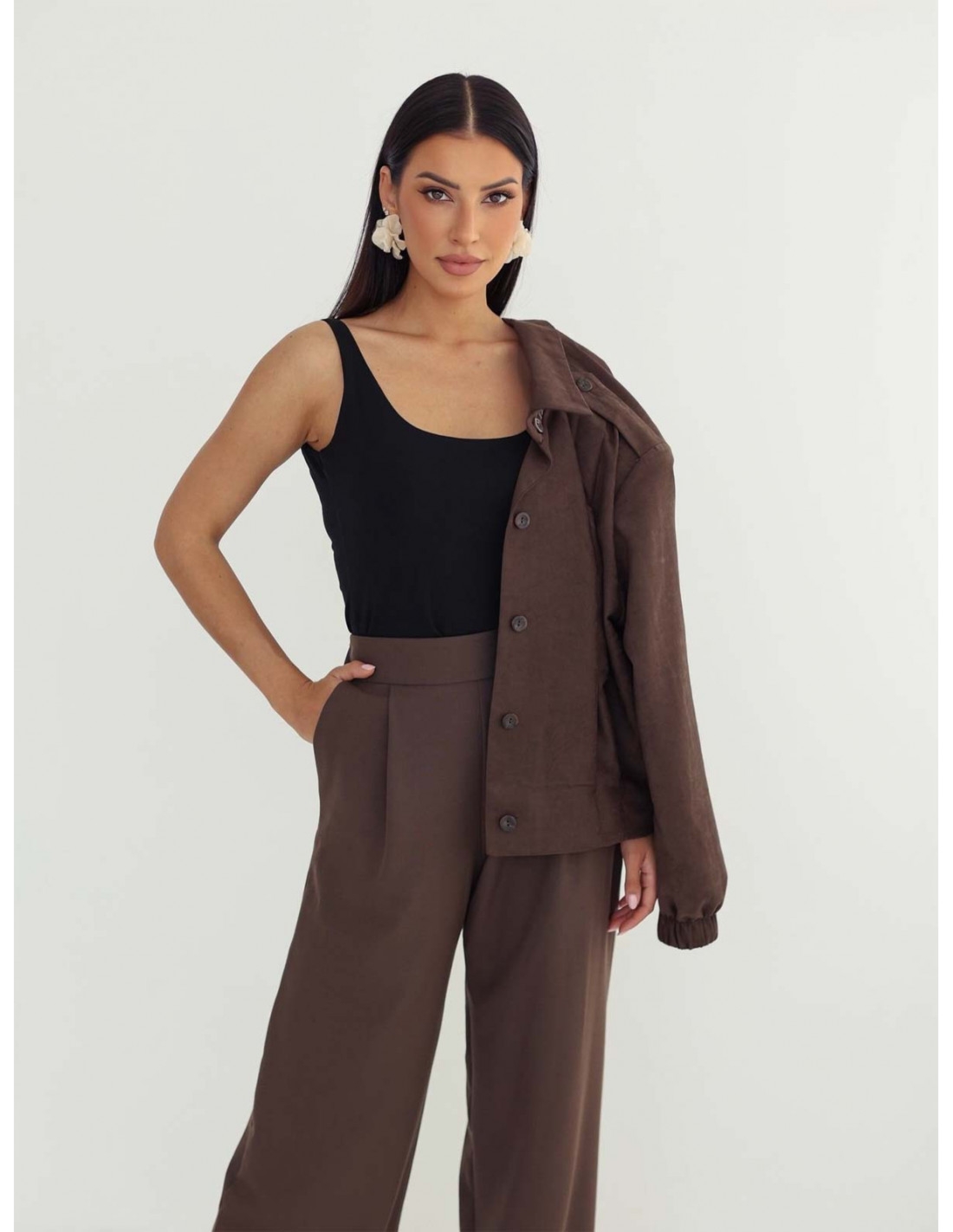 Zamszowa kurtka katana TAVIA – czekoladowa Zanurz się w jesienny trend z naszą zamszową kataną – kwintesencją stylu i wygody na chłodniejsze dni. Ten model to klasyczna kurtka przejściowa z modnym kołnierzem i zapięciem na guziki, która świetnie sprawdzi się zarówno w pracy, jak i na co dzień. Rękawy zakończone gumką dodają jej casualowego luzu, a poduszki w ramionach subtelnie podkreślają sylwetkę. Dzięki wszytej gumce w dolnej części pleców, katana doskonale układa się na ciele i trzyma fason. Jej czekoladowy odcień idealnie wpisuje się w trendy na jesień, a zamszowe wykończenie nadaje całości eleganckiego charakteru. Stylizuj ją z klasycznymi spodniami z wysokim stanem i botkami na słupku lub narzuć na dzianinową sukienkę i kozaki. To must-have dla każdej miłośniczki miejskiego szyku. Jeśli szukasz modnego i praktycznego okrycia – właśnie je znalazłaś! Polski producent O.N.E.
