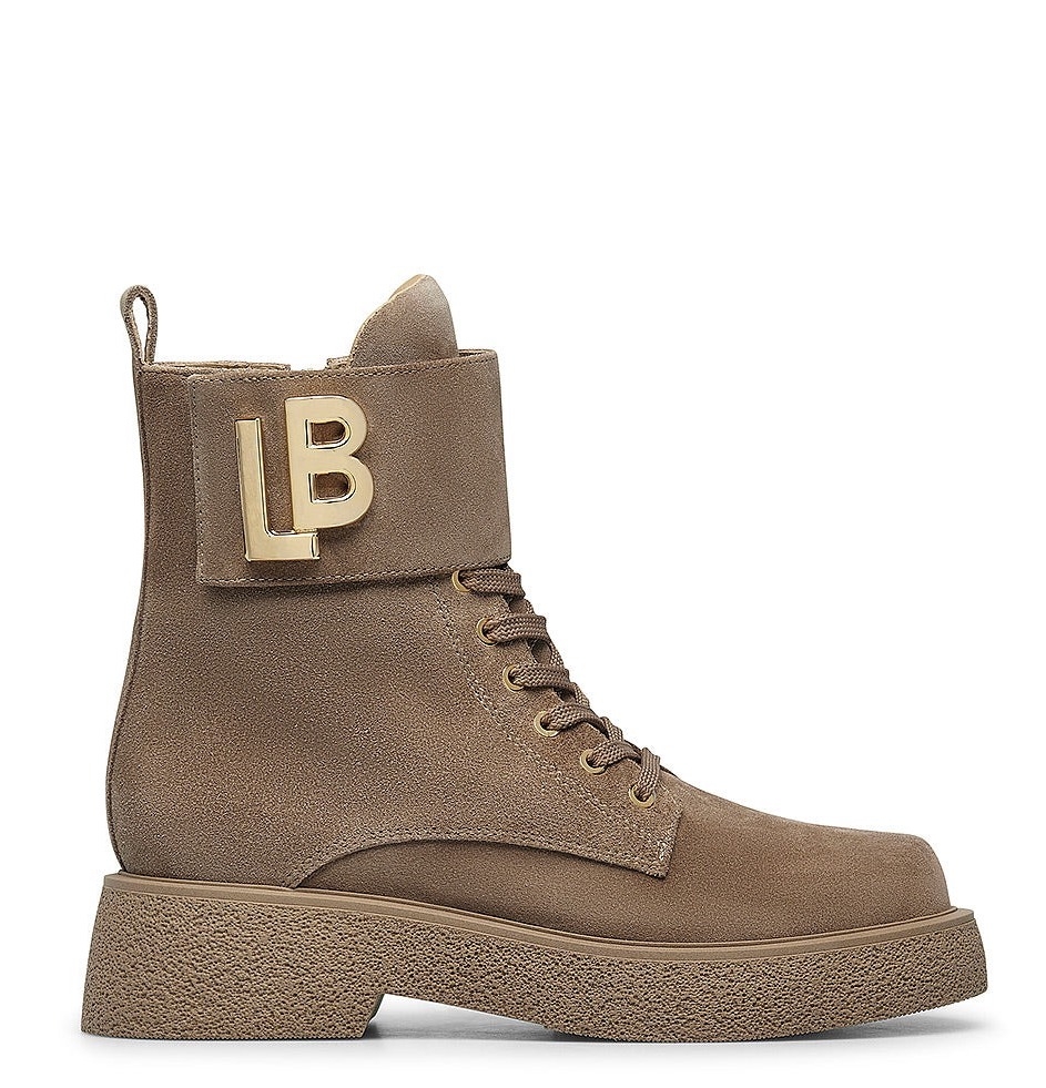 Bikery Loriblu skórzane z logo i futrem. Mają wysokość za kostkę i są wiązane na sznurówki. Z boku znajduje się złoty logotyp. Brązowa zamszowa skóra jest miękka w dotyku. Gruba podeszwa zapewnia dobrą przyczepność do powierzchni. Bikery doskonale sprawdzą się w połączeniu ze spodniami jeansowymi lub dresowymi, jak również z krótką spódniczką i skórzaną kurtką. Loriblu to włoski rodzinny brand, który specjalizuje się w luksusowym obuwiu. Każdy model wykonany jest ze szczególną dbałością o każdy detal.