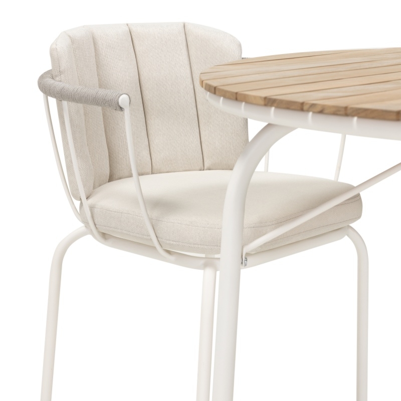 Zestaw Fioli to synonim stylu i funkcjonalności. Jego centralnym punktem jest okrągły stół z drewnianym blatem, który zachwyca naturalnym wyglądem i trwałością. Białe, smukłe nóżki nadają konstrukcji lekkości, doskonale komponując się z różnymi ogrodowymi aranżacjami. Dzięki temu stół nie tylko prezentuje się wyjątkowo, ale także zapewnia solidność i stabilność podczas codziennego użytkowania.